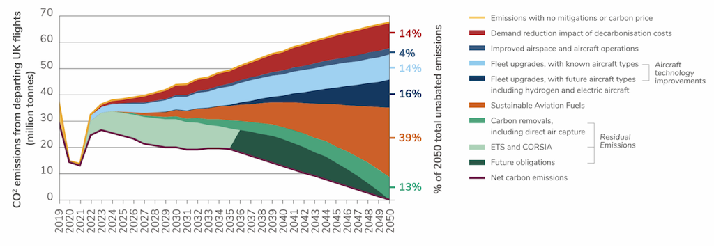image: Sustainable Aviation Carbon Road-Map, detailing how aviation will achieve net zero carbon emissions commitment by 2050, reducing CO2 output from around 39m tonnes to zero while still growing UK aviation
